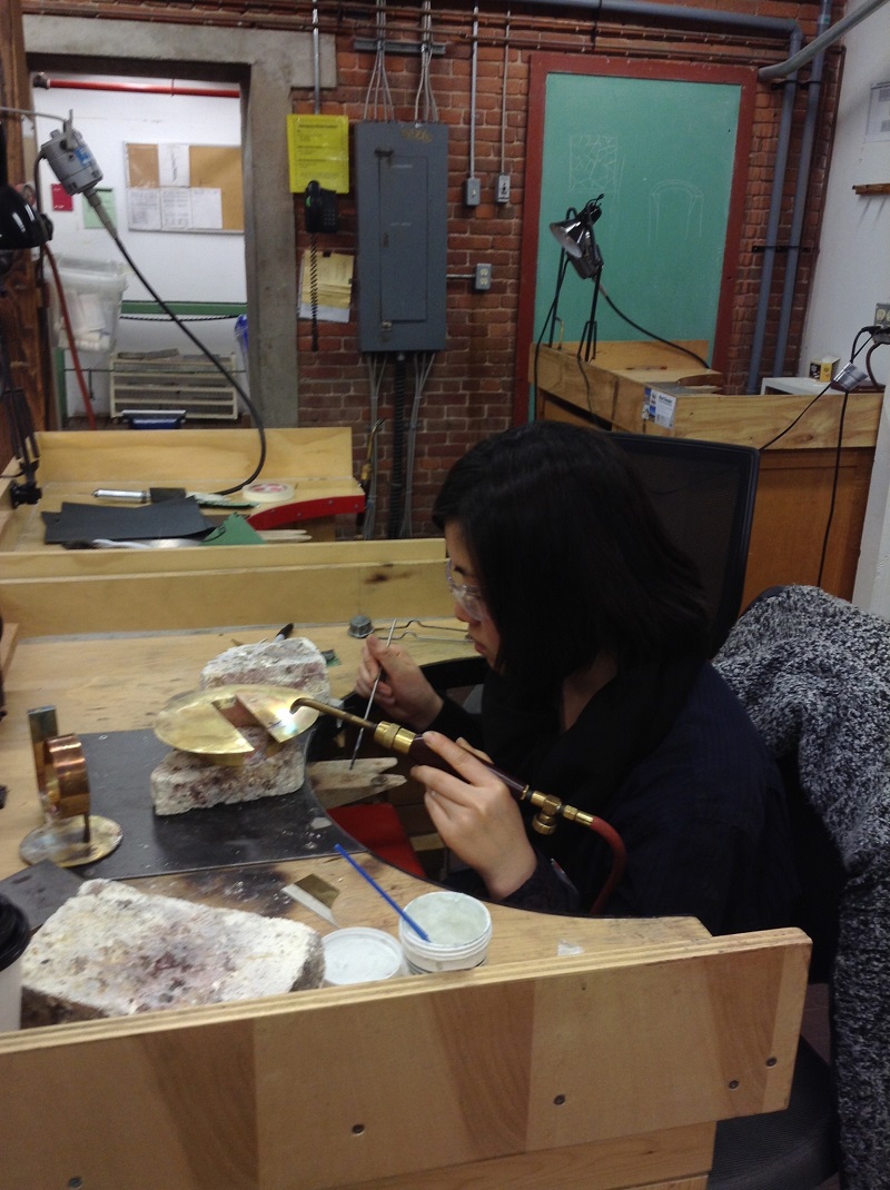 ジュエリーデザインを2クラス(ジュエリーとホーローウェアー)、陶器轆轤のクラス、金工と木工がセットになっているクラスの4つの授業を履修しました。1授業につき3~4時間、それぞれに課題が出されて期日までに仕上げるのですが、授業によって課題の分量はまちまちでした。ジュエリーの授業では、指輪、ブローチ、ネックレスなどの指定がありましたが、ホーローウェアー(hollowware=深い食器類)の授業では金属を使う事、接合、表面の加工や研磨などのスキルを使う事を満たしていれば、何でも作ることが出来ました。